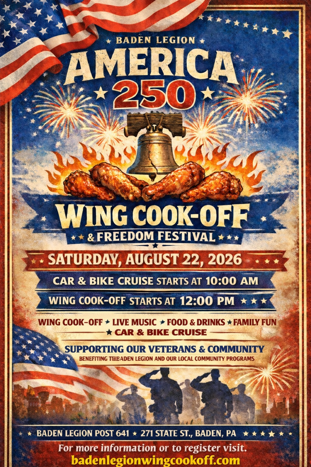 Join us at the Baden American Legion as we celebrate America’s 250th Anniversary with the Baden Legion America 250 Wing Cook-Off & Freedom Festival.